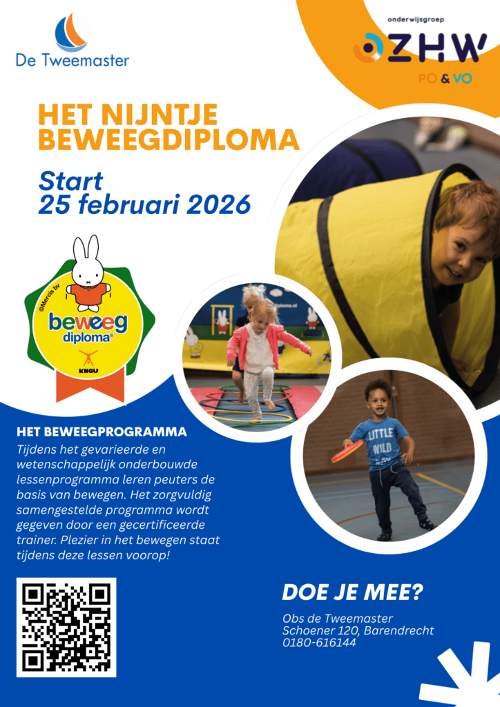 Als officiële aanbieder mag De Tweemaster het nijntje beweegprogramma aanbieden aan kinderen van 2 tot 4 jaar. Het nijntje beweegprogramma draagt bij aan het zich volledig breed motorisch ontwikkelen van kinderen. In het programma zitten basisvaardigheden die belangrijk zijn voor een goede motorische ontwikkeling van een kind. Denk hierbij aan vaardigheden zoals vangen, gooien, schoppen, rollen, springen, balanceren, klauteren en huppelen. De oefeningen worden aangepast aan het niveau van bewegen van het kind. Het programma is zorgvuldig samengesteld door de KNGU en wordt alleen gegeven door opgeleide en gecertificeerde trainers. Aan het eind van de lessencyclus van 20 lessen ontvangen de peuters een nijntje Beweegdiploma.